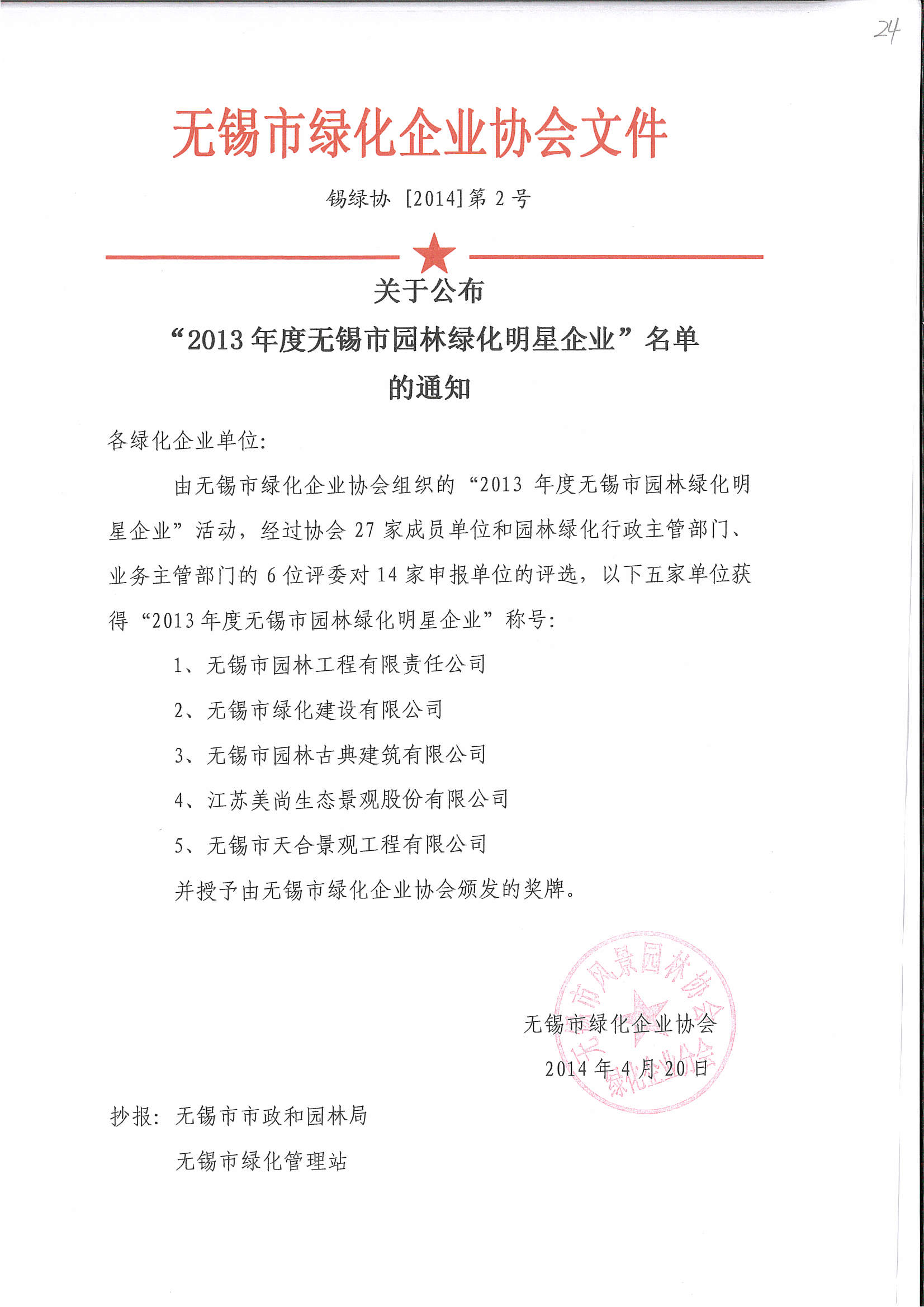 2013年度無(wú)錫市園林綠化明星企業(yè)